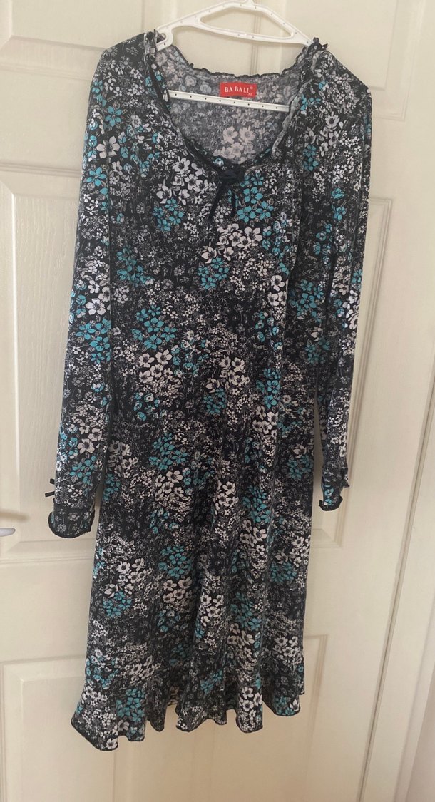 Uzun kollu, V yakalı ve bol kesimli hamile geceliği, koyu renkli çok renkli çiçek desenine sahiptir. Rahat gece kullanımı için uygundur.