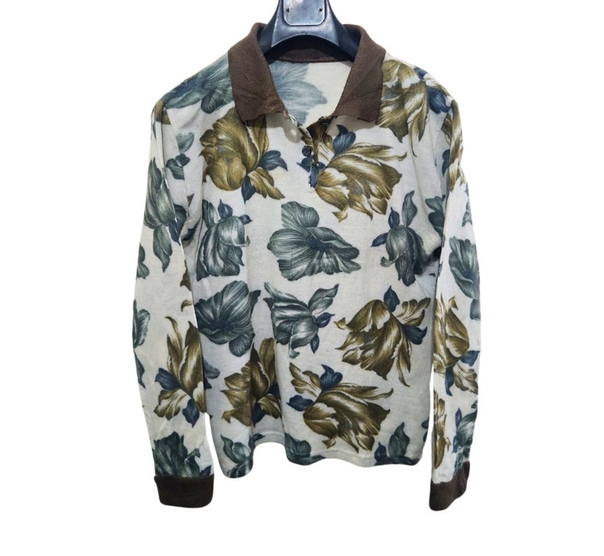 Bej renkte, çiçek desenli, düğmeli, yakalı, uzun kollu, bol kesim kadın gömleği. Günlük ve sokak stili için uygundur. 68×59