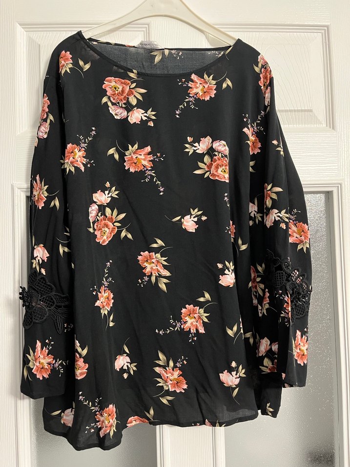 Bu kadın bluzunda siyah zemin üzerinde çiçek desenleri ve uzun kollar bulunur. Bol kesim ve drapeli tasarıma sahiptir, günlük kullanıma uygundur. yalnizca fotografta gosterildigi gibi kucuk bir kusuru var