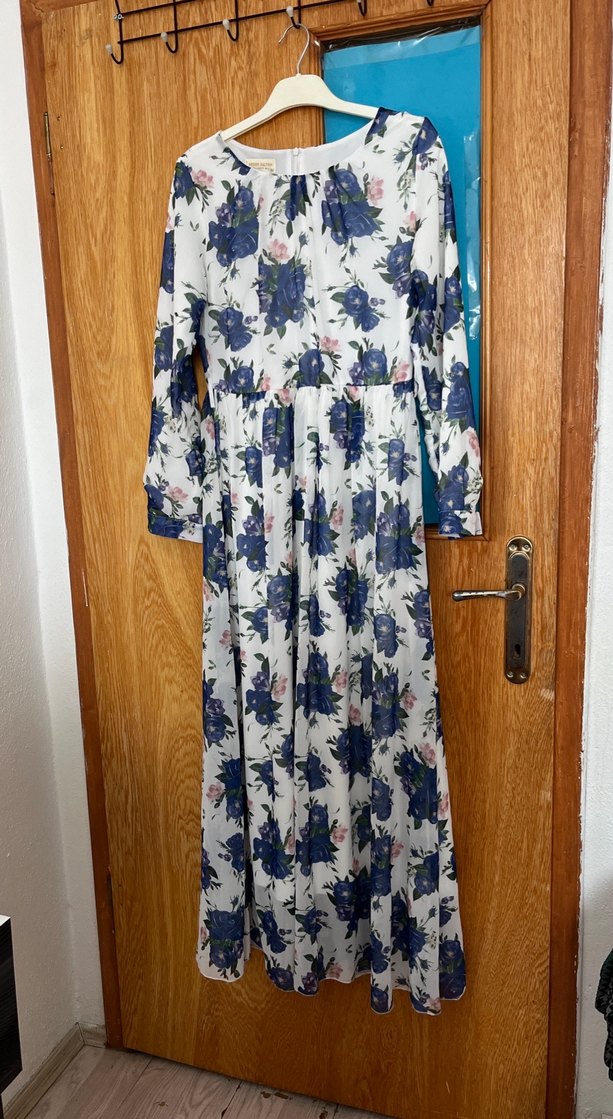 Uzun kollu, bol kesim kadın elbisesi, çiçek desenli ve açık renkli kumaştan, günlük kullanım için uygundur.