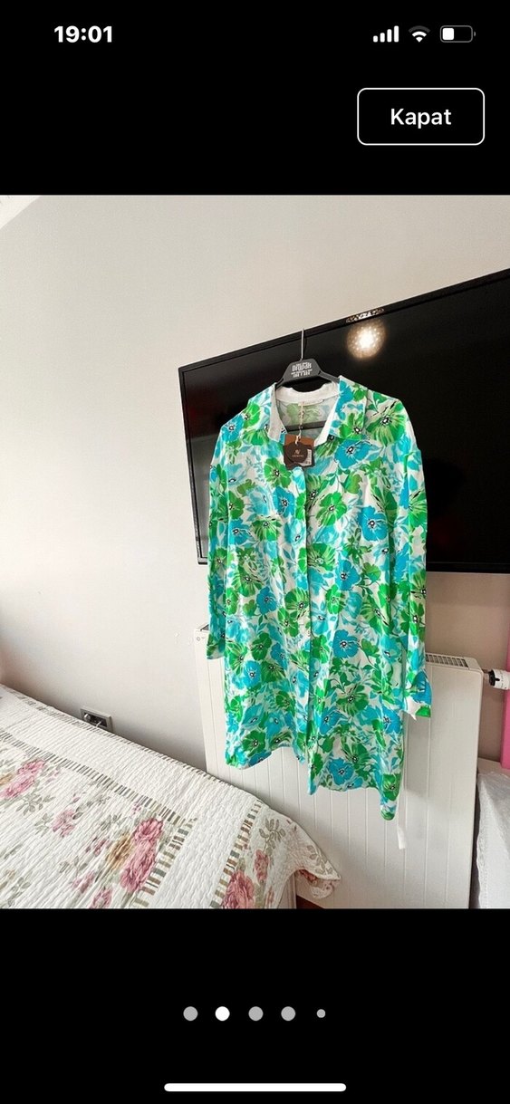 Bol kesim, uzun kollu, yakalı ve düğmeli kadın gömleği. Canlı çok renkli yeşil mavi çiçekli batik desenli, yumuşak sentetik kumaştan, günlük rahat kullanım için uygun.