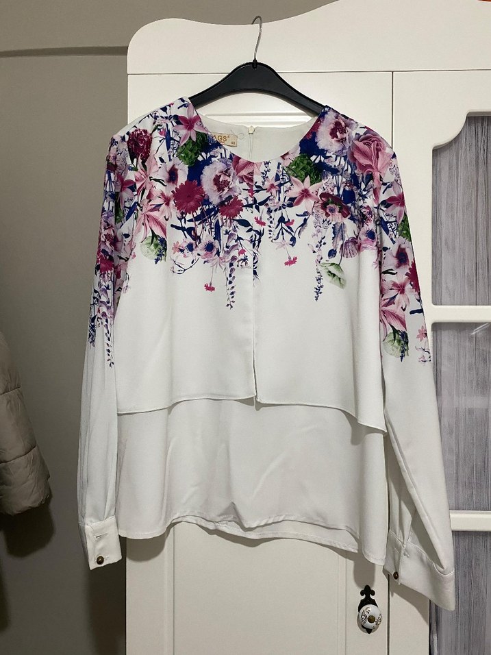 Beyaz renkli, uzun kollu, yuvarlak yakalı, bol kesim midi boy kadın gömlek. Üst kısmında renkli çiçek desenleri ve düğmeli manşetler bulunur. Sentetik kumaştan üretilmiştir.