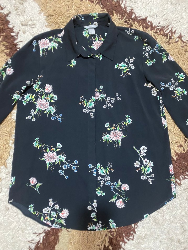 Yumuşak sentetik kumaştan, bol kesim, yakalı ve düğmeli, koyu renkli çiçek desenli kadın gömleği. Uzun kollu, midi boyda, %100 polyester