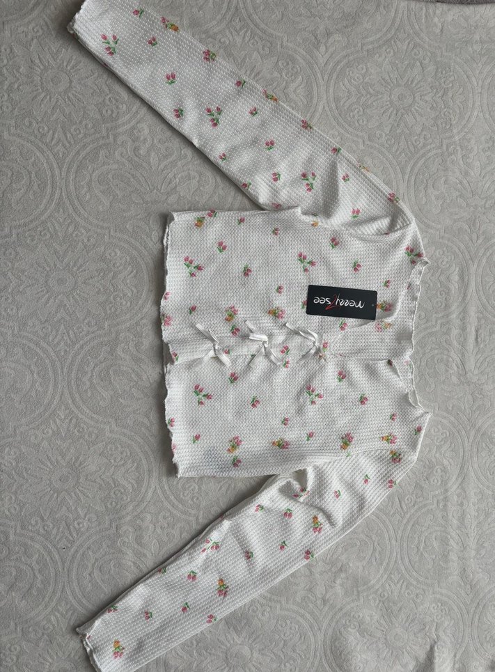 Düğmeli ön kısmı ve çiçek desenleriyle, uzun kollu ve tekne yaka, fitted kesim kadın bluzu. Yumuşak sentetik kumaş kullanılmış.