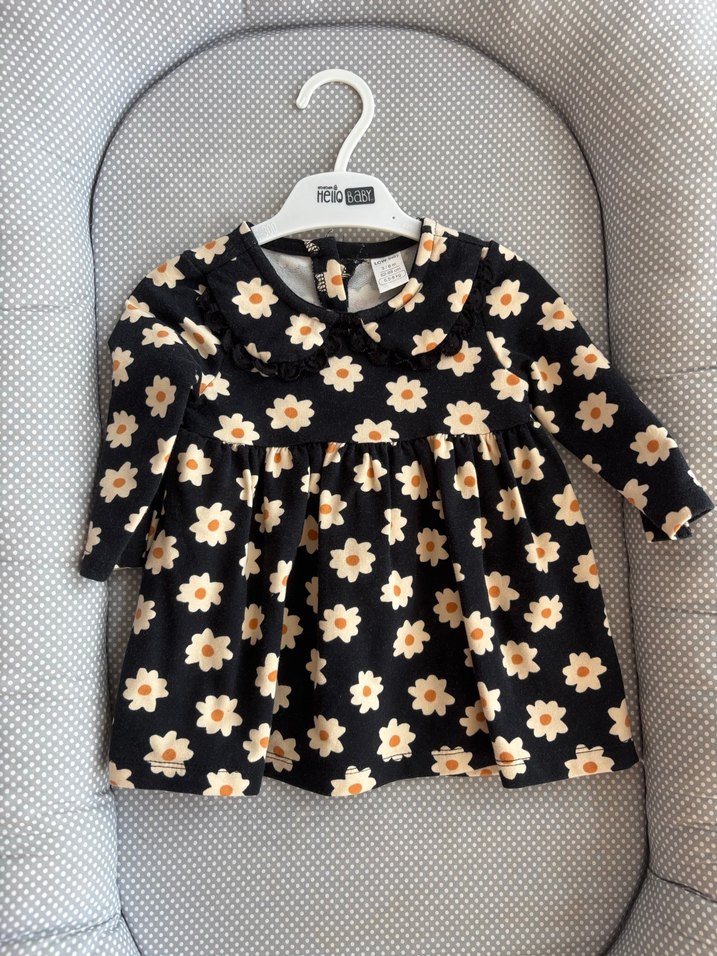 Yumuşak ve sıcak kumaştan, siyah zemin üzerine çiçek desenli, uzun kollu, yakalı ve fırfırlı kız çocuk elbisesi. Rahat kesim, günlük şık tarz için uygundur. Biz sadece altı ay çekiminde kullandık