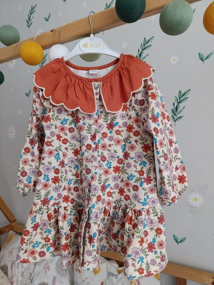 Renkli çiçek desenli, uzun kollu, yakalı ve fırfırlı yakaya sahip bol kesim kız çocuk elbisesi. Yumuşak tekstil malzemeden üretilmiştir.