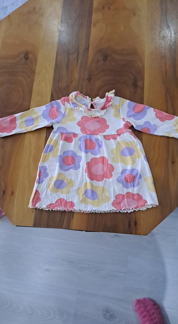 Uzun kollu, yuvarlak yakalı, fırfırlı detaylı bol kesim kız elbisesi. Pastel tonlarda çiçek desenli, yumuşak sentetik kumaştan yapılmıştır.
