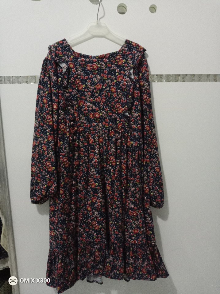 Bohem tarzda, uzun kollu, renkli çiçek desenli, fırfırlı ve bol kesim kız elbisesi, bisiklet yaka ile.