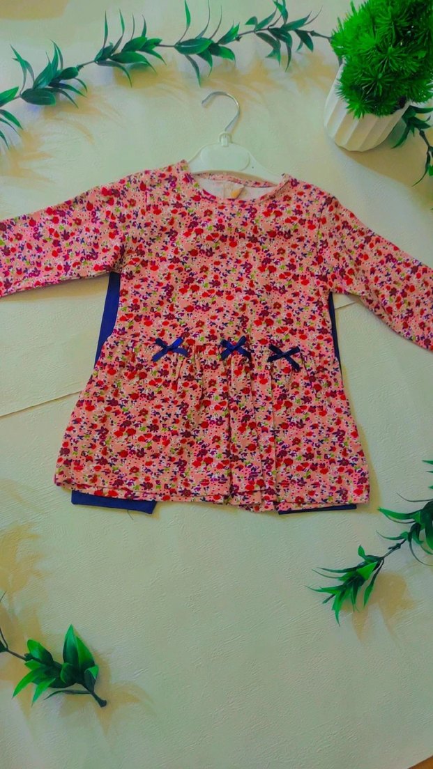 Renkli pembe elbise, uzun kollu ve yuvarlak yakalıdır. Çiçek desenli, bol kesim ve belde küçük fiyonk detaylarıyla dikkat çeker.
