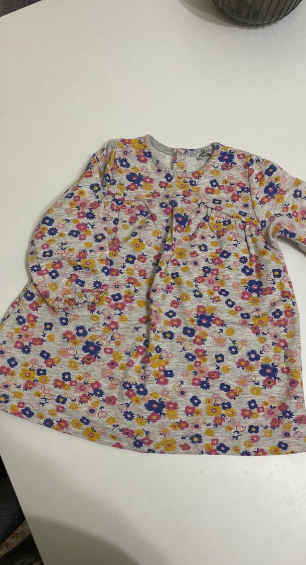 Renkli çiçek desenli, uzun kollu, düğmeli ve bol kesim kız elbisesi, bohem tarz için uygun. Bir çok kere giyindi ama tertemiz lekesiz yırtık vs yok
