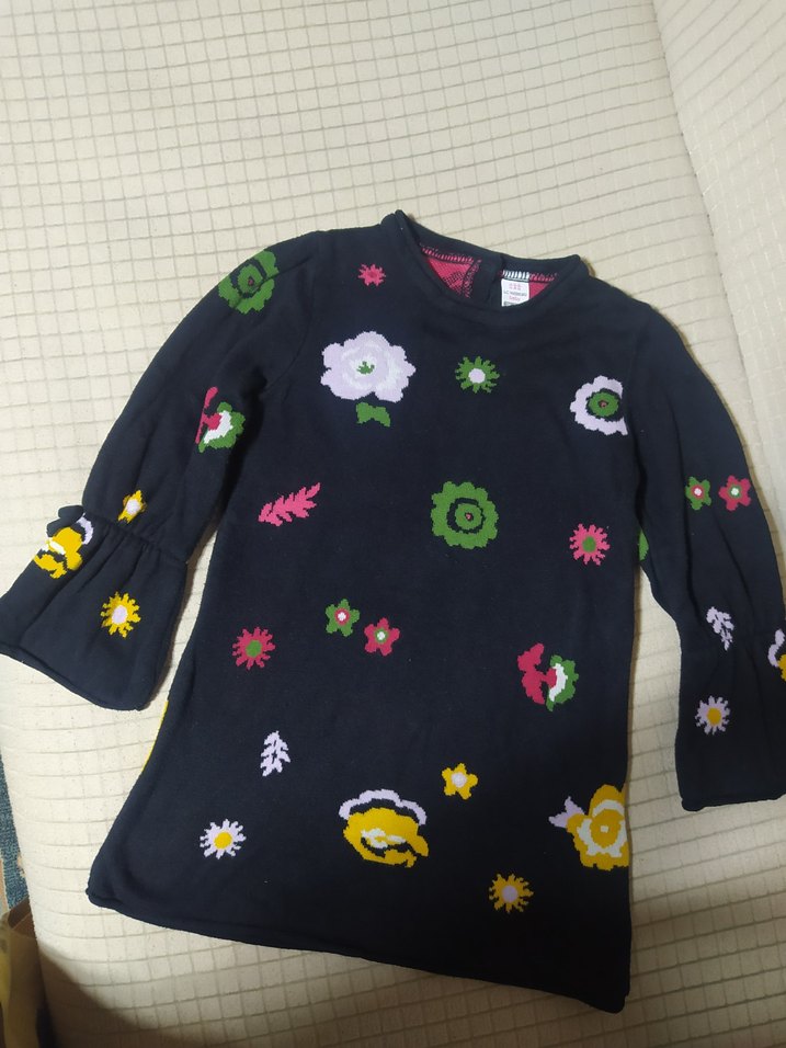 Koyu renkli, çiçek desenli, uzun kollu, bisiklet yaka, dar kesim kız çocuk tunik. Örgü dokulu tekstilden üretilmiştir. 2.3 yaş