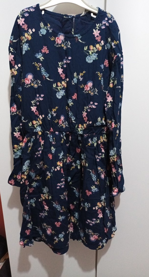 Çiçek desenli, uzun kollu, yüksek yakalı midi boy elbise. Sentetik kumaştan, bol kesim ve fırfır detaylı bohem tarzda.