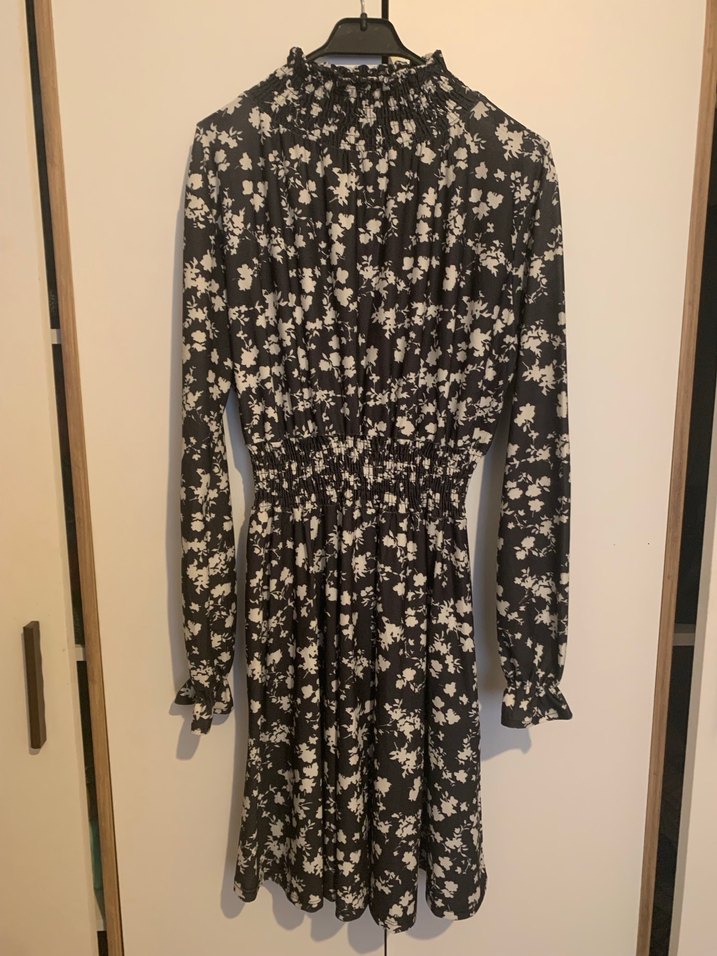 Siyah ve gri renklerde, uzun kollu, yüksek yakalı, pileli detaylı çiçek desenli, bol kesim midi elbise. Günlük kullanıma uygun.