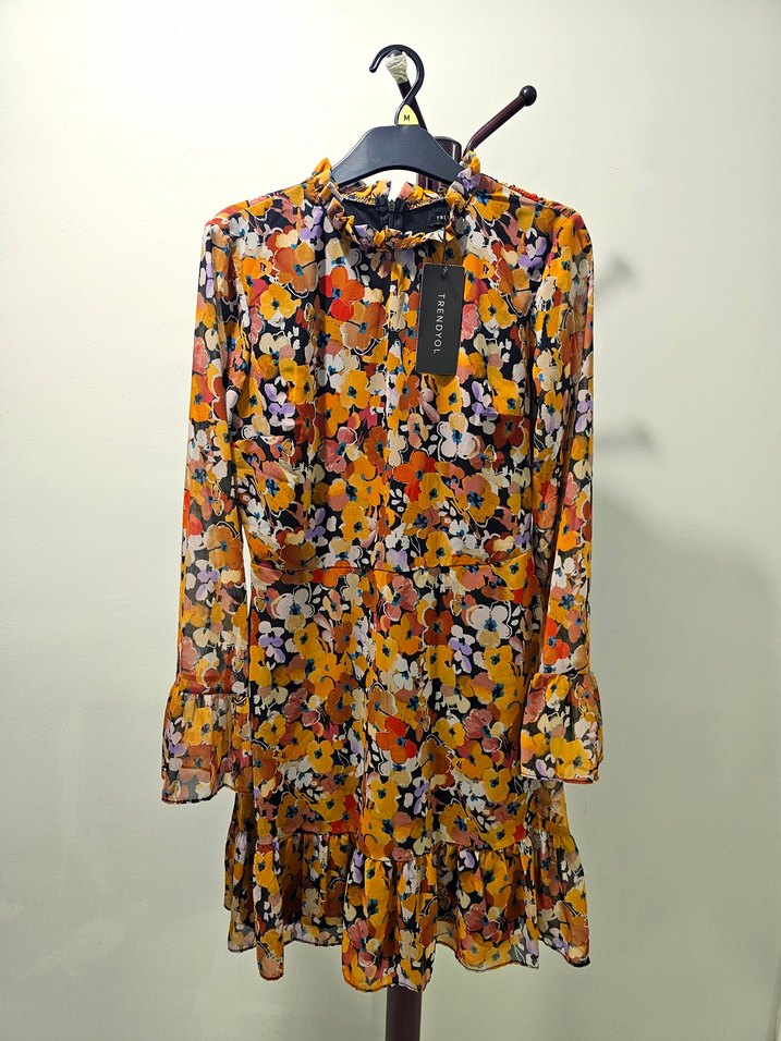 Bohem tarzda, uzun kollu, yüksek yakalı ve fırfırlı detaylı elbise. Çok renkli çiçek desenli, yumuşak sentetik kumaştan, günlük kullanıma uygun. Sıfır etiketli ürün Trendyol marka.