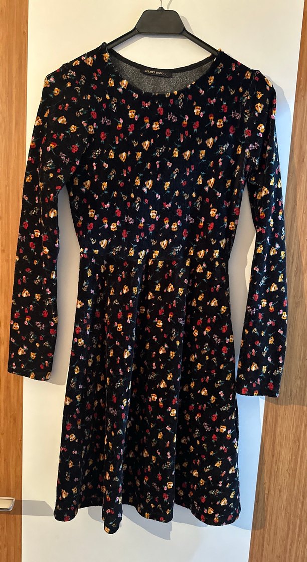 Fitted kesim, uzun kollu ve yuvarlak yakalı midi elbise, koyu zemin üzerinde çok renkli çiçek desenleri ve pile detayına sahiptir.