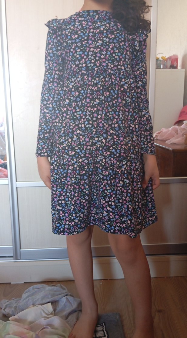 Yumuşak sentetik kumaştan, uzun kollu ve yüksek yakalı, volan detaylı, bol kesim midi elbise. Koyu renkli çok renkli çiçek desenlidir, günlük kullanım için uygundur.
