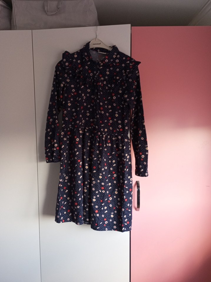 Çiçek desenli, düğmeli, uzun kollu ve yüksek yakalı, rahat kesim midi elbise. Günlük kullanıma uygun şık bir parça.