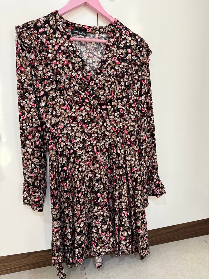Koyu pembe midi elbise, bol kesim, uzun kollu ve V yakalıdır. Fırfır detayları ve çiçek deseniyle bohem tarzı yansıtır.