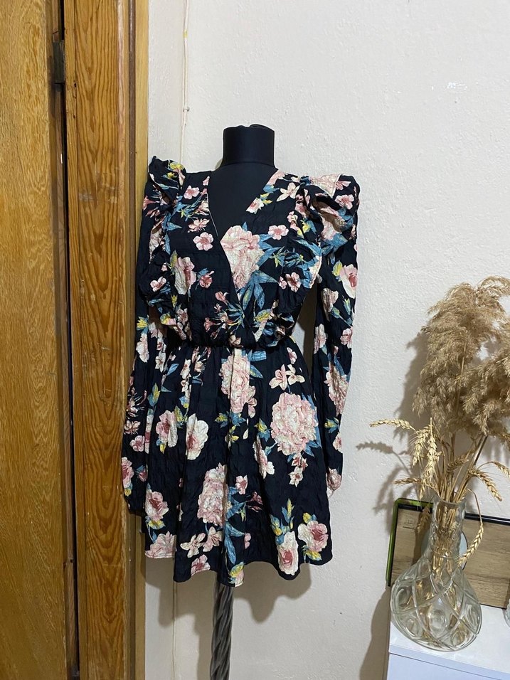 Bohem tarzda, uzun kollu ve V yakalı, çiçek desenli, fırfırlı, sentetik kumaştan yapılmış bol kesim mini elbise.