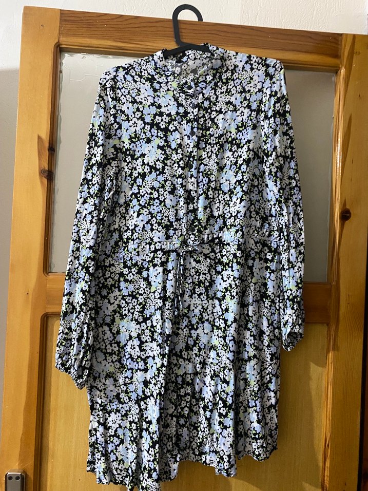 Düğmeli önü, uzun kollu, yakalı ve bol kesim çiçek desenli mini elbise. Günlük kullanıma uygun, çok renkli yumuşak tonlarda.