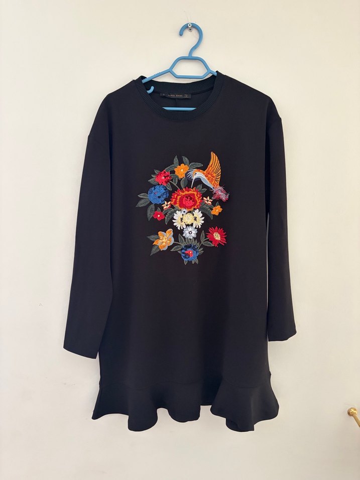 Uzun kollu, bisiklet yaka, mini elbise. Çok renkli çiçek baskısı ve etek kısmında fırfır detayları bulunur. Sokak modasına uygun, avangart tarzda.