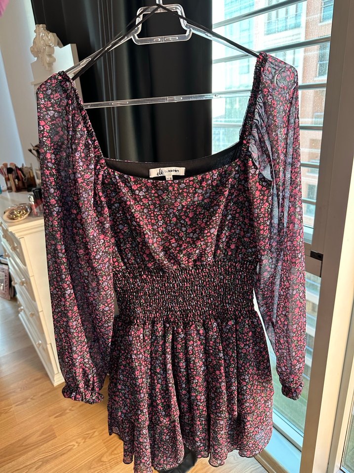 Çiçek Desenli Uzun Kollu Mini Elbise