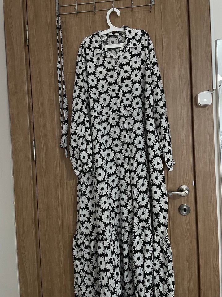 Uzun kollu, düğmeli ve bol kesim bu elbise, siyah beyaz çiçek deseniyle yumuşak sentetik kumaştan üretilmiştir.
