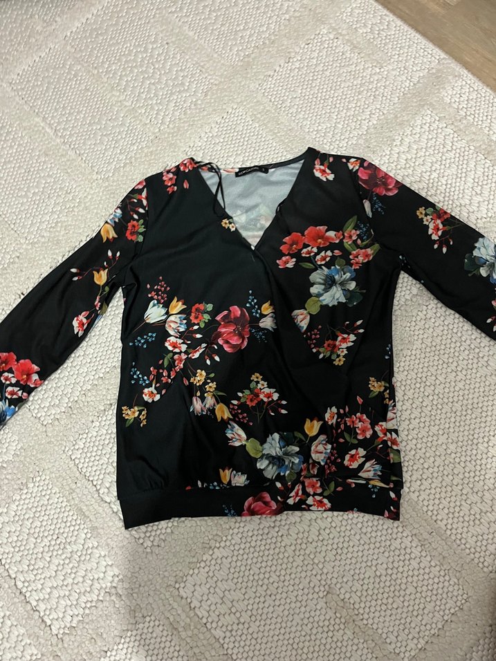 Çiçek desenli, uzun kollu, V yakalı, bol kesim bluz. Yumuşak sentetik kumaştan, düğmeli ve koyu renkli çok renkli desenlere sahip, bohem tarzına uygun.