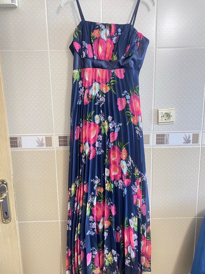 Karanlık renkli sentetik kumaştan, çiçek desenli ve pilili uzun, askılı, fitted kadın elbisesi. Bohem tarzda parti için uygundur.