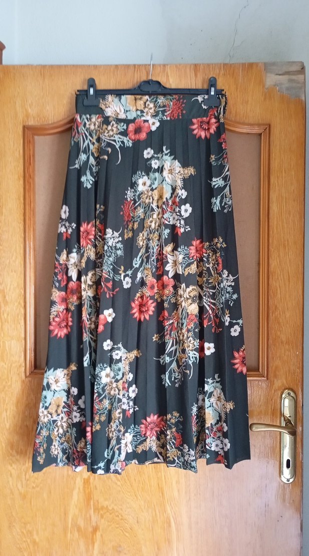 Sentetik kumaştan, koyu renk çiçek desenli uzun piliseli etek. Bol kesim ve bohem stilinde, günlük kullanıma uygundur.