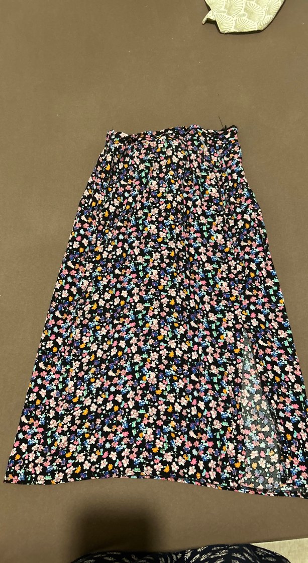 Bu uzun etek, bol kesim ve piliseli detaylarla, yumuşak sentetik kumaşta koyu çok renkli çiçek desenine sahip, bohem tarzını yansıtıyor.