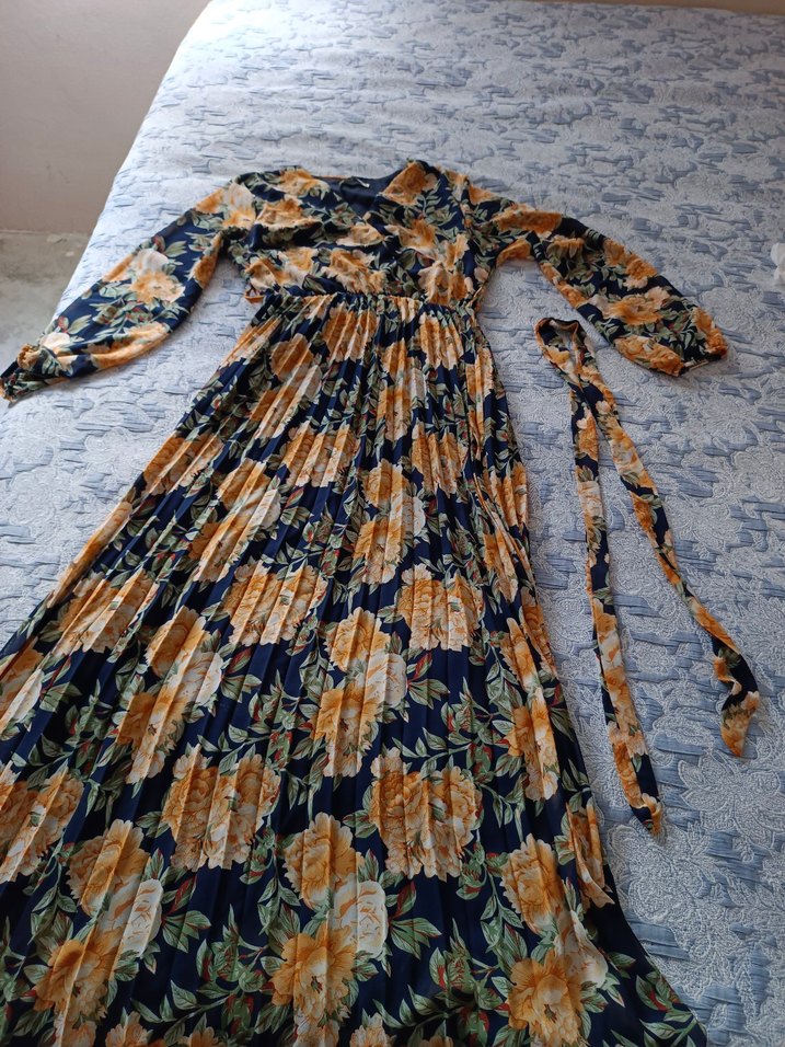 Uzun, bol kesim piliseli, koyu renk çiçek desenli elbise. kollarında astar yok etek kısmında midi bi astar var hiç kullanılmadı