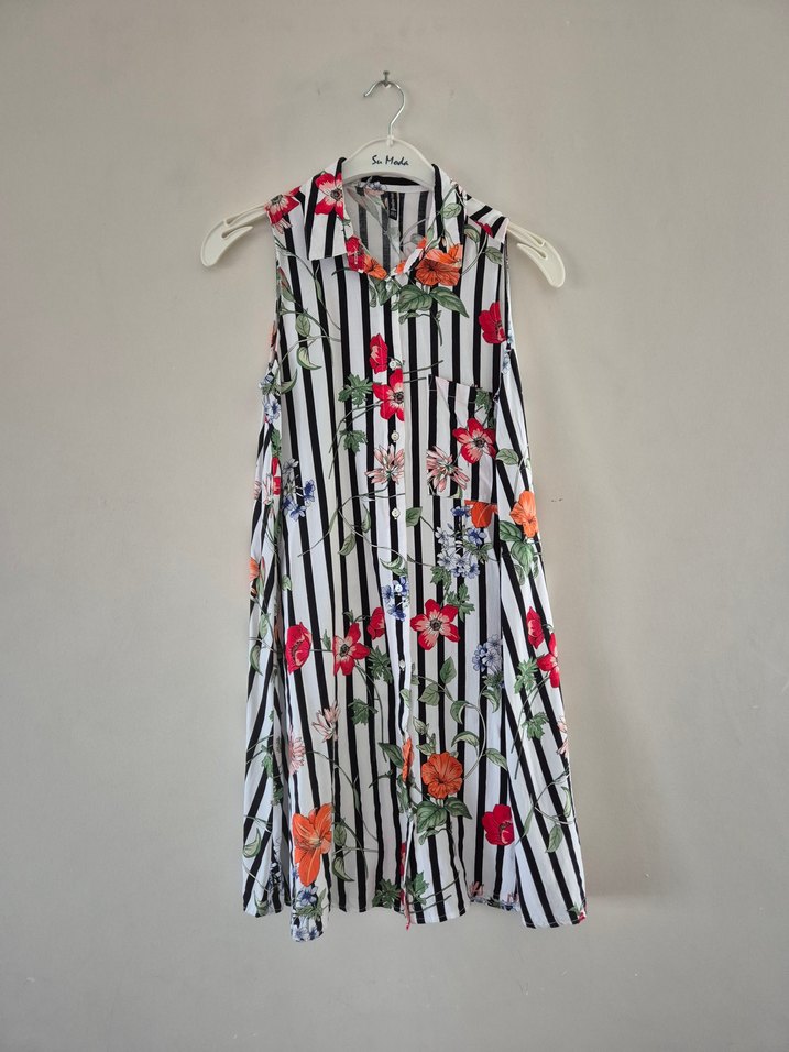 Çiçek desenli, uzun ve kolsuz bu elbise, dikey çizgilerle renkli bir görünüme sahip. Yumuşak sentetik kumaştan, salaş kesimli ve pile detaylıdır.