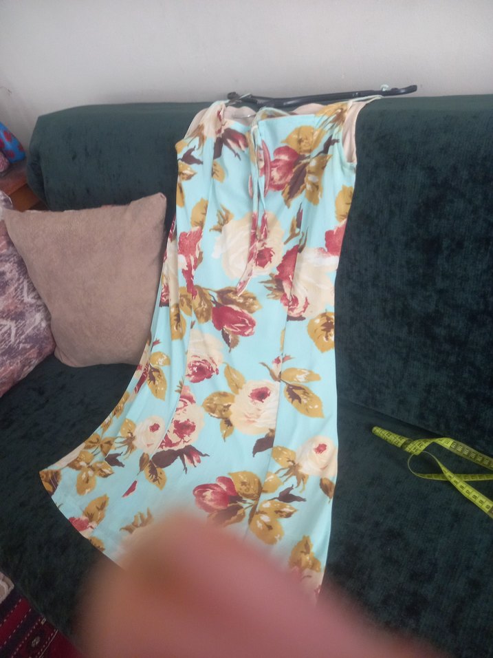 Çiçek desenli, uzun ve straplez bu elbise, drapeli ve bohem tarzda. Yumuşak sentetik kumaştan, günlük kullanım için rahat.