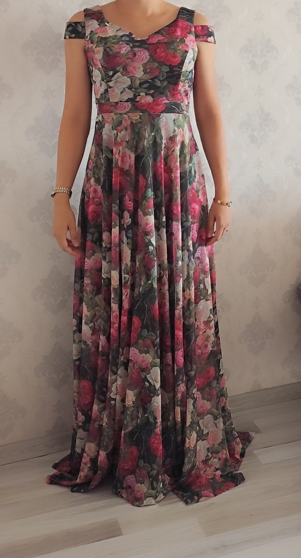 Çiçek desenli, çok renkli gri tonlarında, uzun straplez ve drapeli, bol kesim bohem elbise. Yumuşak sentetik kumaştan, düğünler için uygun.