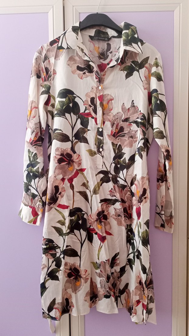 Çiçek desenli, uzun kollu, düğmeli ve V yaka tunik. Sentetik kumaştan, bol kesim ve çok renkli açık tonlarda.