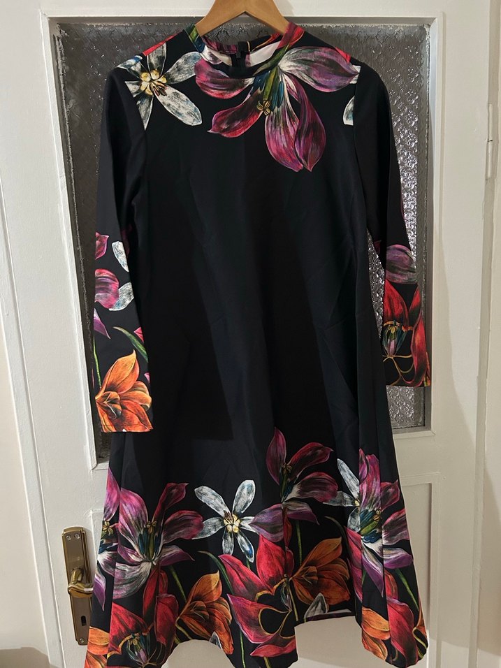Yüksek yakalı, uzun kollu, sentetik kumaştan yapılmış, dökümlü, çiçek desenli koyu renkli bol kesim tunik. Tunik boyu 106 cm, omuz genişliği 11 cm , göğüs genişliği 89 cm , kol boyu 57 cm’dir. Etek genişliği 222 cm’dir. Koltuk altından kloş inmektedir. Kendi dikimimdir.