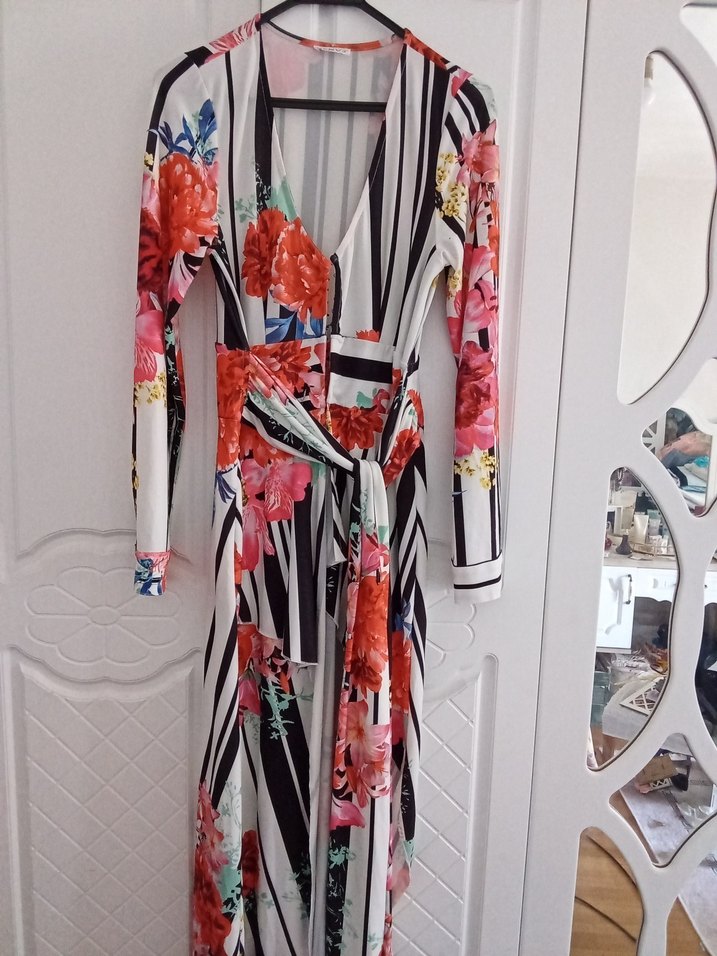 Çiçek ve siyah-beyaz çizgili desene sahip, uzun, dar kesim, V yakalı, uzun kollu, belden drapeli bohem elbisedir.