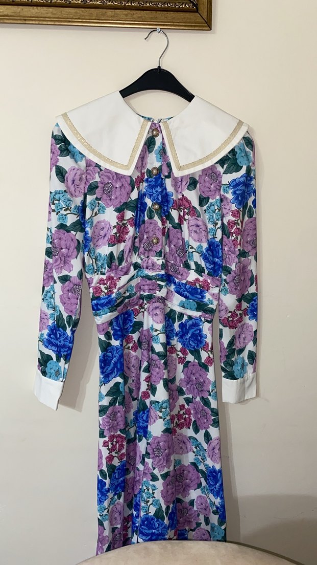 Fitted kesim, pastel tonlarda çiçek desenli uzun vintage elbise. Beyaz yakalı ve uzun kolludur.