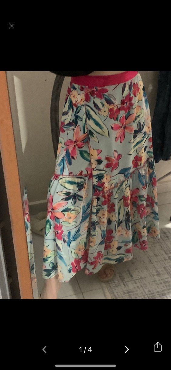 Yumuşak sentetik kumaştan yapılmış, pastel çiçek desenli ve volan detaylı uzun, bol kesim etek. Günlük kullanıma uygun bohem tarzı yansıtıyor. Hiç giyilmedi 38 beden uyumlu
