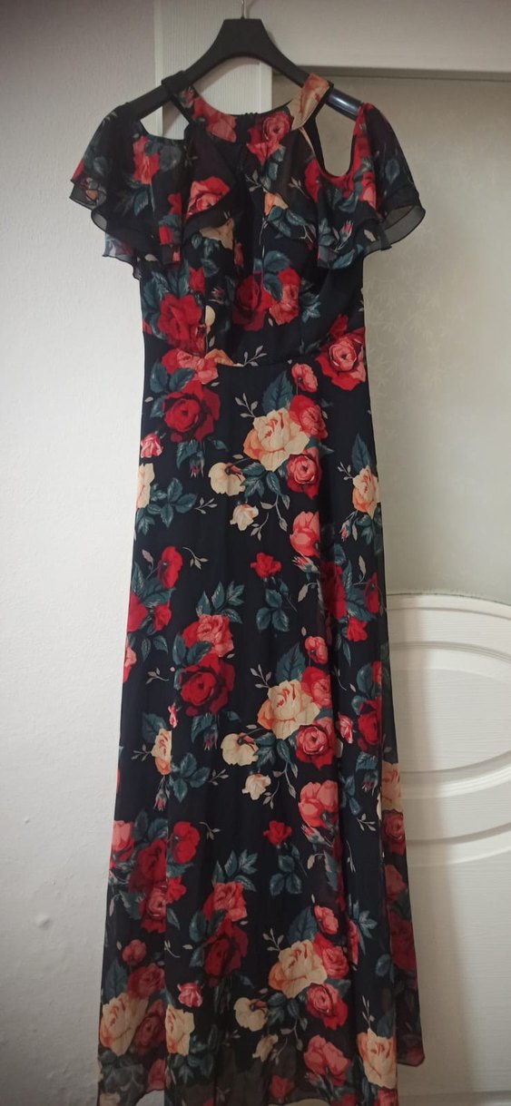 Çiçek desenli, straplez ve volan detaylı uzun elbise, sentetik kumaştan yapılmıştır. Bohem ve vintage tarzlara uygun, romantik akşamlar için ideal.