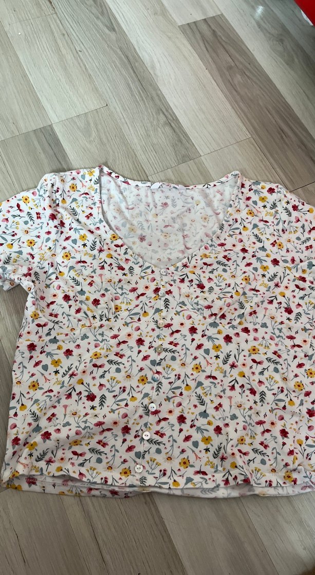 Pamuk kumaştan, kısa kollu, V yakalı ve düğmeli beyaz hamile bluzu. Hafif çiçek desenli, bol kesim ve günlük kullanıma uygun.