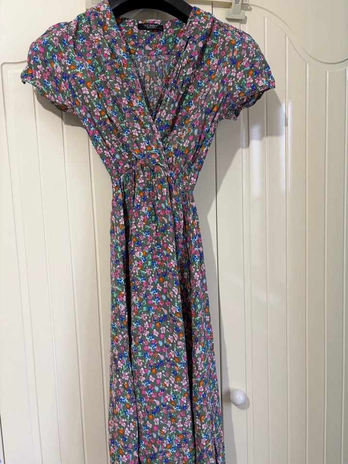 Uzun, v yaka ve kısa kollu, drapeli tasarıma sahip bu dar kesim elbise, yumuşak sentetik kumaştan yapılmıştır. Pastel tonlarda renkli çiçek desenlidir.