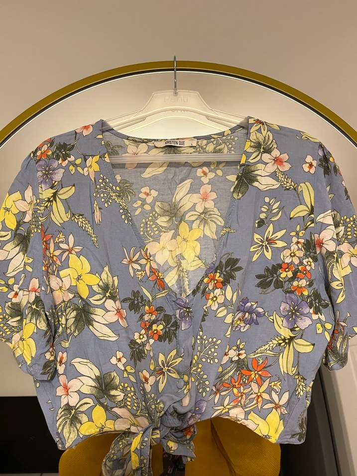 Çiçek desenli, kısa kollu, V yaka ve düğmeli önü olan bol kesim kadın bluz. Yumuşak kumaştan, bohem tarz için uygun.