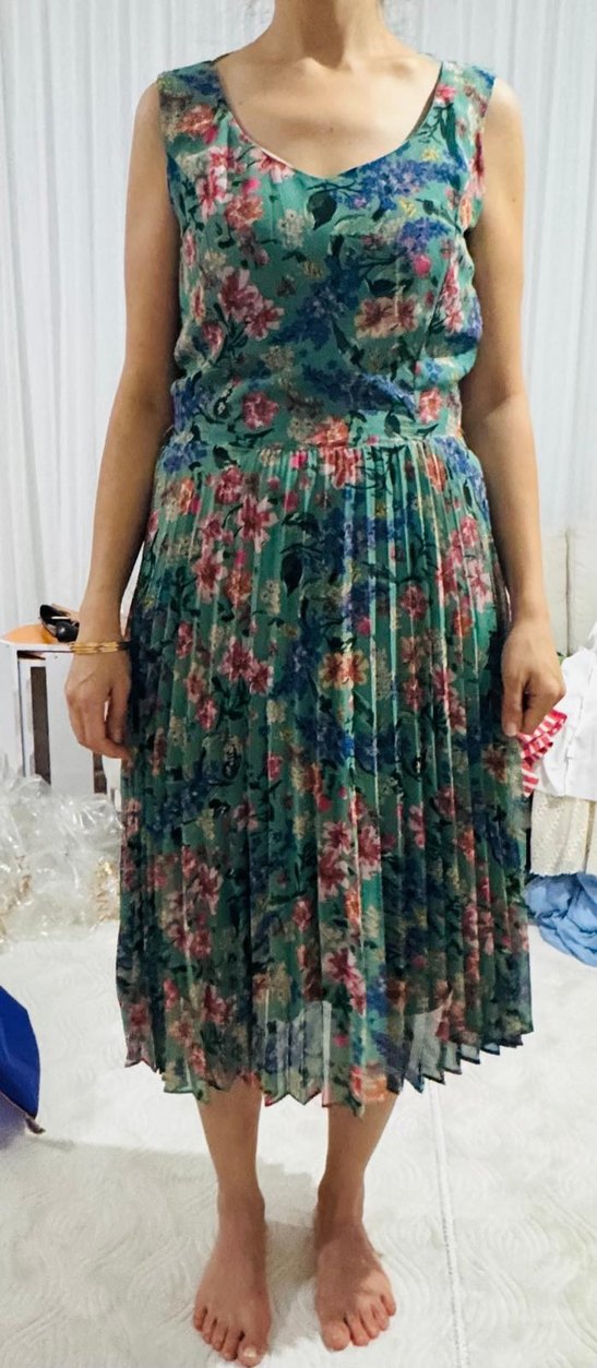 V yaka, kolsuz, bol kesim midi elbise, pilili etek ve pastel çiçek desenli. Yumuşak sentetik kumaştan, parti için uygun.