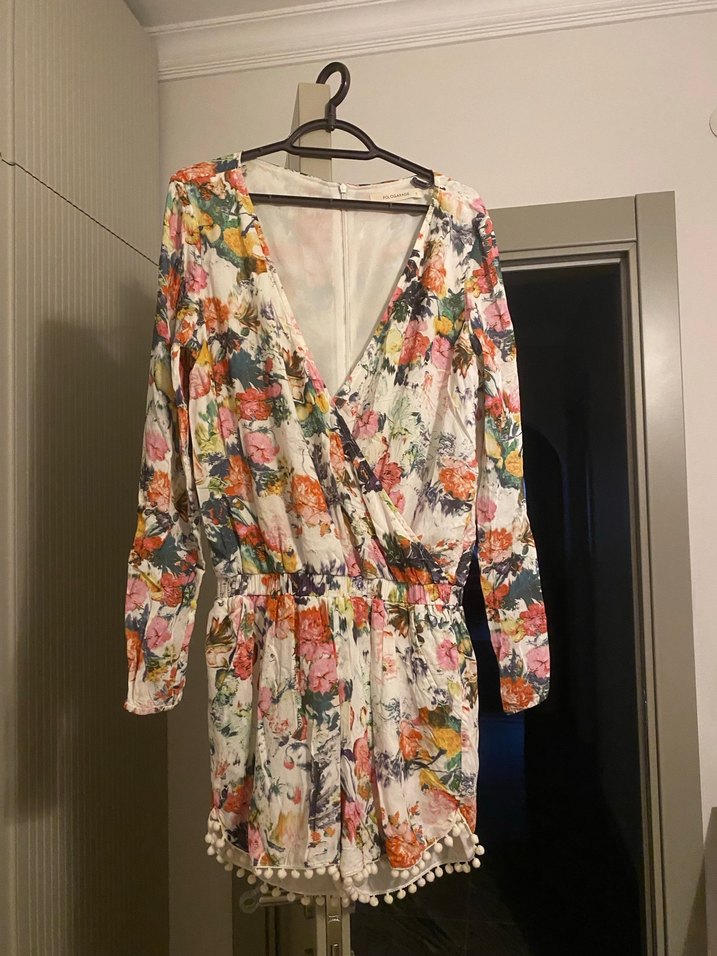Çiçek desenli, V yakalı ve uzun kollu bohem stil tulum. Rahat kesimi ve drapeli yapısıyla, renkli desenli sentetik kumaştan üretilmiştir. Günlük kullanıma uygundur.