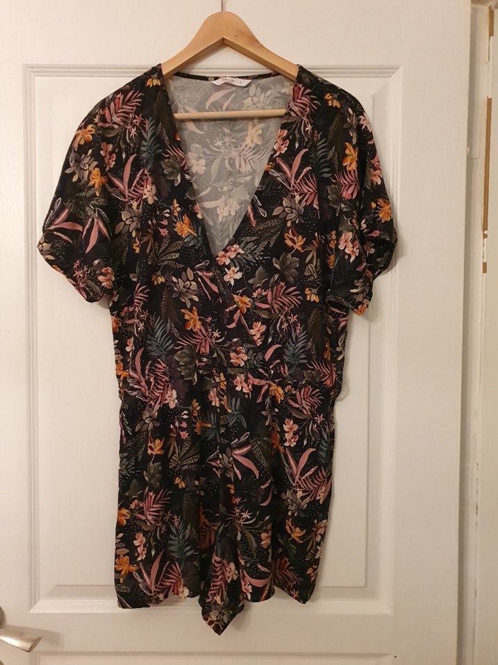 V yaka, kısa kollu, alti şort tulum. Koyu renkli çiçek desenli, dökümlü tasarım. Yumuşak viskoz kumaştan.