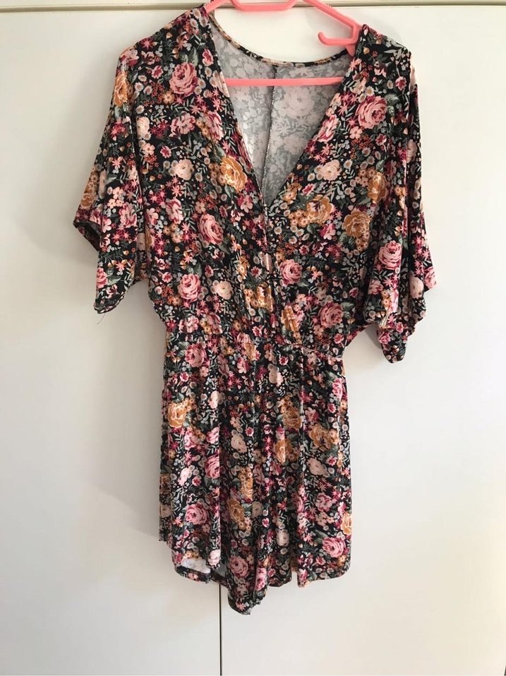 V yakalı, kısa kollu, dökümlü ve bol kesim bohem tulum. Koyu renkli çok renkli çiçek desenine sahip, yumuşak sentetik kumaştan yapılmıştır.