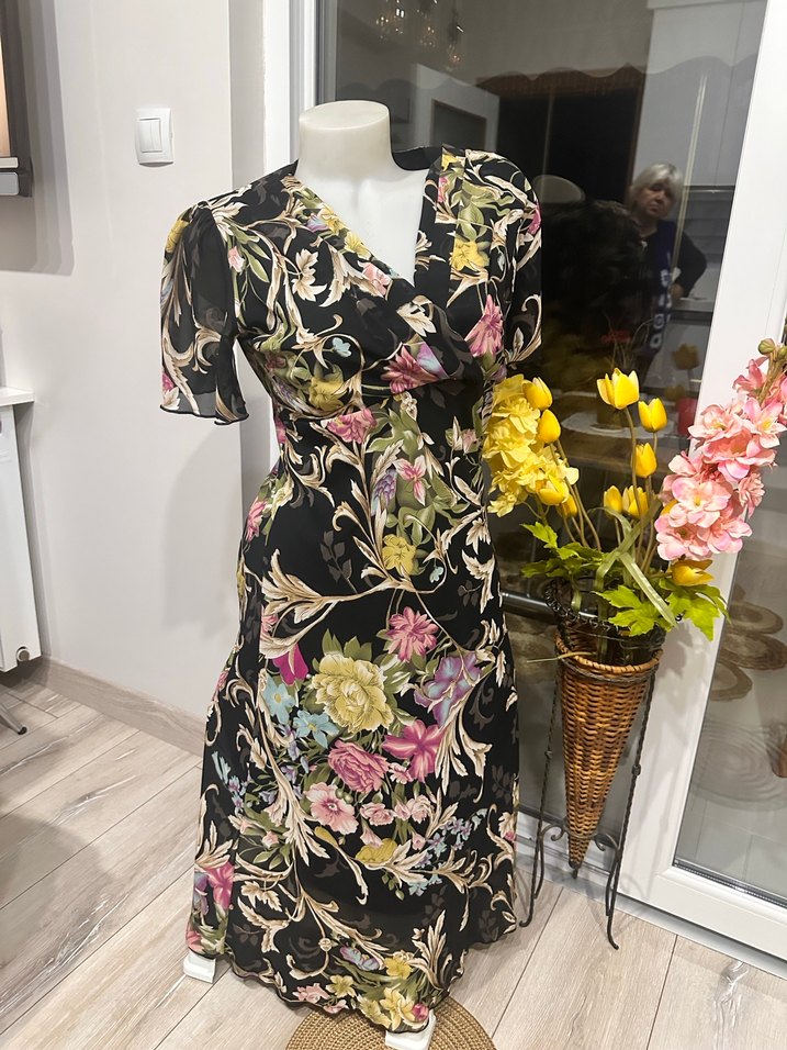 V yaka, kısa kollu, dökümlü kesim diz altı elbise. İpek gibi kumaştan, koyu renkli çok renkli çiçek desenli, ofis için uygun bohem tarz elbise.