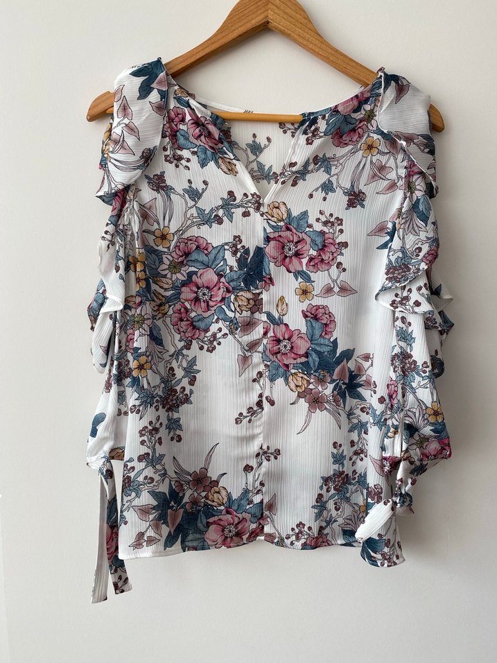 V yaka, fırfırlı ve çiçek desenli bohem bluz. Kolsuz ve bol kesim, günlük kullanıma uygun hafif renklerde.